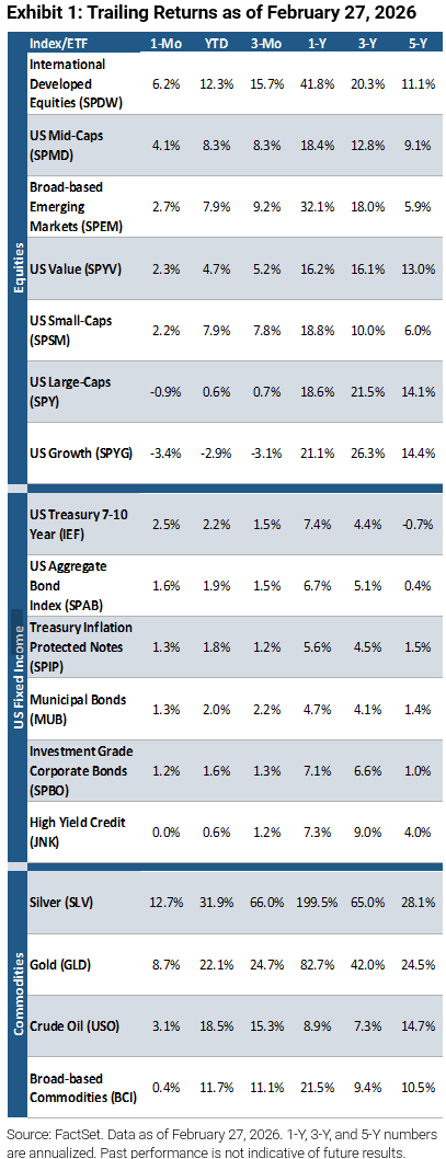 Amid heightened scrutiny of AI-related capex, geopolitical tensions, and a hotter-than-expected inflation report late in the month, US large-cap equities came under pressure in February, with the Nasdaq 100 and S&P 500 declining 2.3% and 0.8%, respectively. However, market leadership continued to broaden beyond mega-caps, as the S&P 500 Equal Weight Index (+3.6%) outperformed its market-cap-weighted counterpart. International developed equities (+6.2%) led gains, followed by US mid-caps (+4.1%) and emerging market equities (+2.7%). Bonds mostly fared well as 7-10 year US Treasuries rose 2.5%, the US Aggregate Bond Index gained 1.6%, and Treasury Inflation Protected Notes increased 1.3%. Commodities produced positive returns as silver was up 12.7%, gold gained 8.7%, crude oil rose 3.1%, and broad-based commodities increased 0.4%.